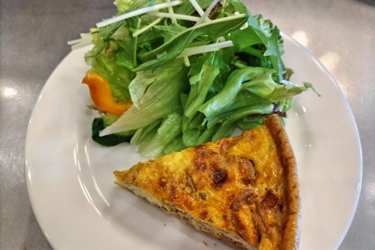 練りパイ生地をを底に、ベーコン、玉ねぎ、マッシュルーム、ほうれん草、エメンタールチーズとゴーダチーズを卵と生クリーム、牛乳の生地で焼いています