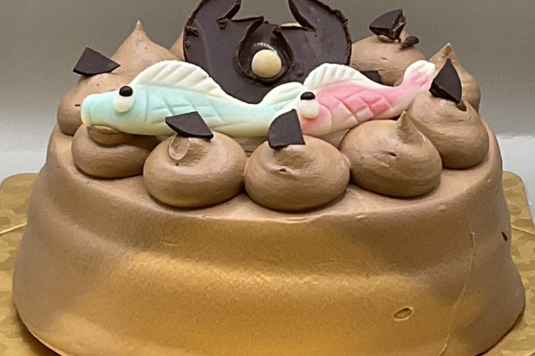 手作りのチョコレートの兜とマジパンで作った鯉が載ります