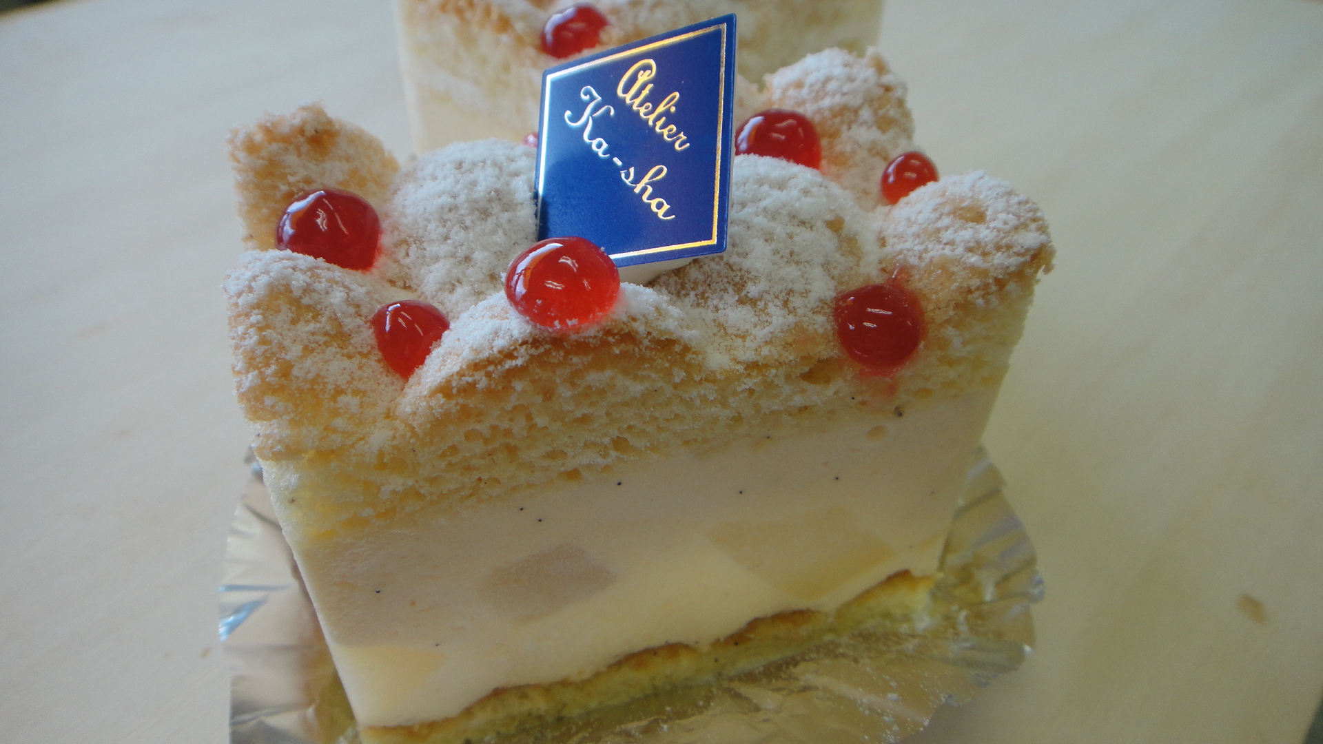 洋梨が出回る時期にだけ作っている洋梨のババロワをシャルロットのビスキュイ生地でサンドしたケーキです洋梨は主に、ラフランスを使っているので洋梨特有の食感と匂いが感じられます